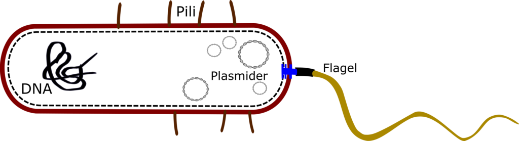 Bakteriers DNA ligger dels som et ringformet kromosom i cytoplasmaet, dels som små ringformede DNA-stykker, som kaldes plasmider. Disse plasmider kan udveksles med andre bakterier og de er et vigtigt redskab, når vi gensplejser bakterier.