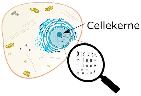 Inde i cellekernen findes det kæmpe molekyle – DNA. De lange DNA-tråde (kromatinet) kan normalt ikke ses i lysmikroskopet. Men ved celledeling pakkes DNA-trådene sammen i en tæt struktur som vi kender som kromosomer. I proteinsyntesen aflæses DNA og det oversættes til proteiner i ribosomerne ude i cytoplasmaet. Ribosomerne er cellens proteinfabrikker, hvor aminosyrerne samles til proteiner. Nogle af proteinerne er enzymer, som bliver sendt ud i tarmen for at nedbryde føden. Andre proteiner er hormoner, som skal ud i blodbanen (fx insulin) eller proteiner som skal indbygges i cellemembranen. Proteiner har mange funktioner, men du skal kunne huske mindst en.